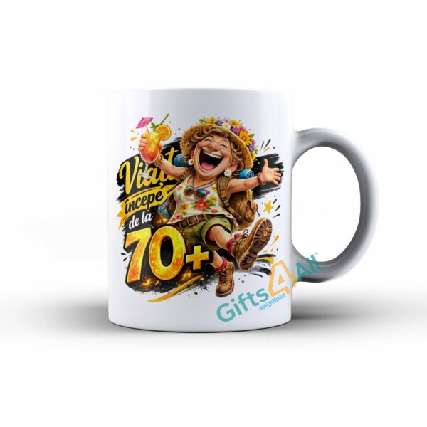 Cană aniversare personalizată 70+, femeie, Funny Premium Gifts4All – cană ceramică 330 ml cu cutie cadou